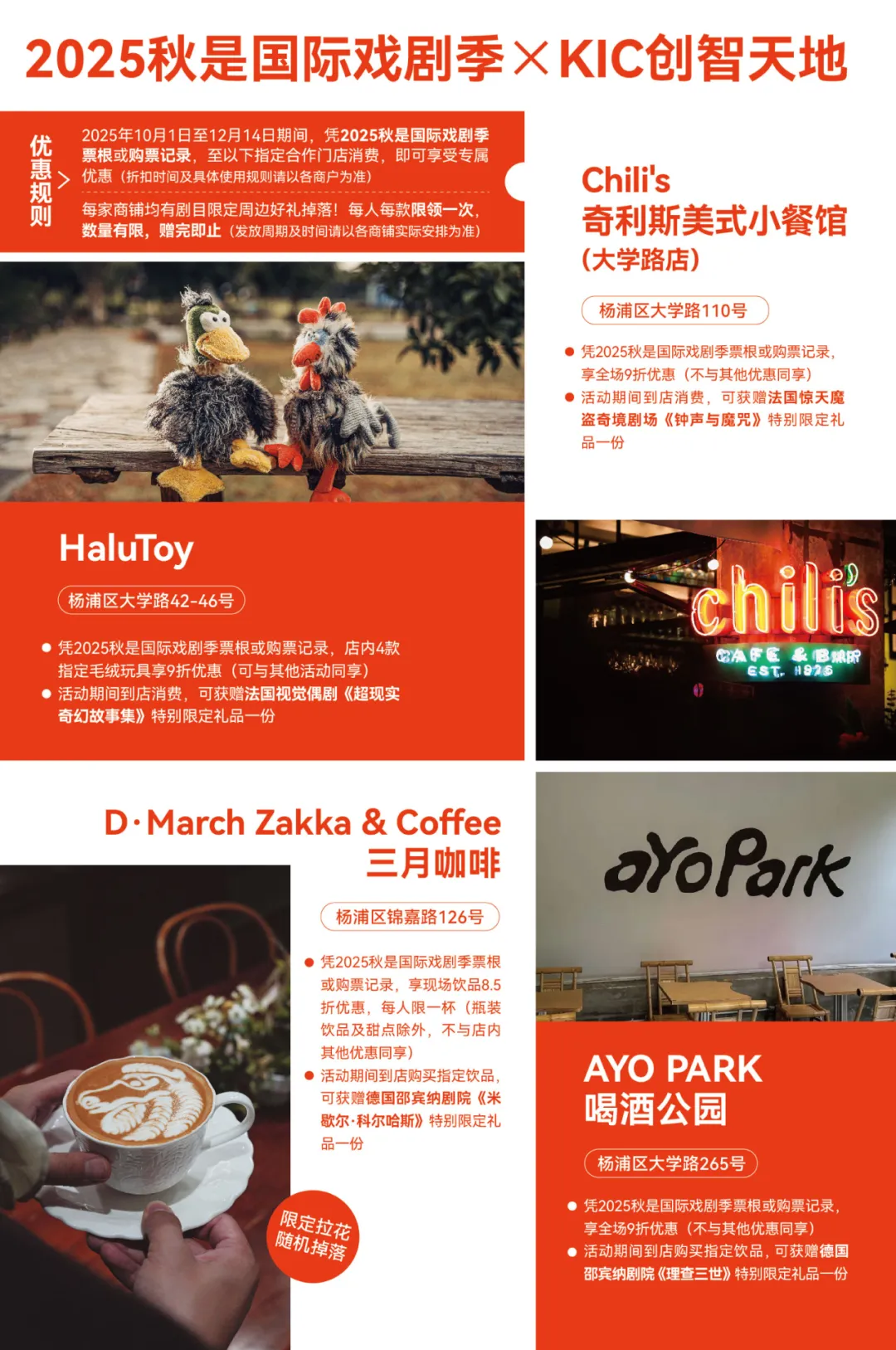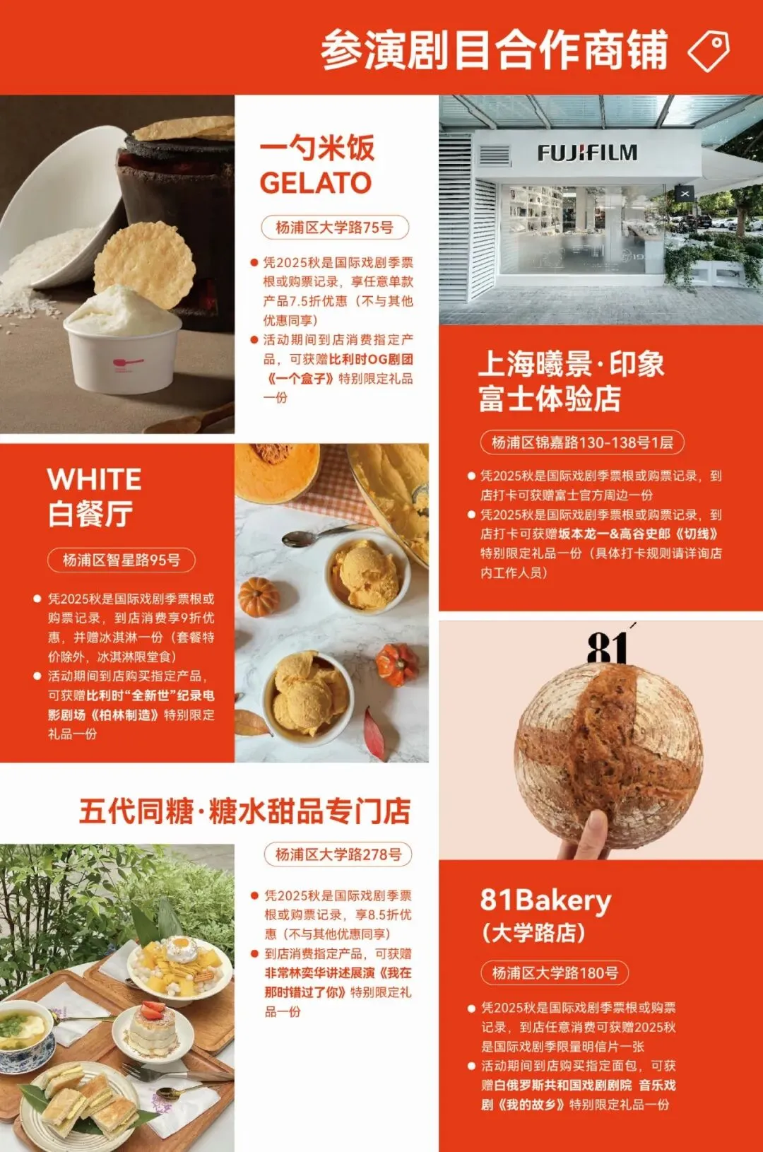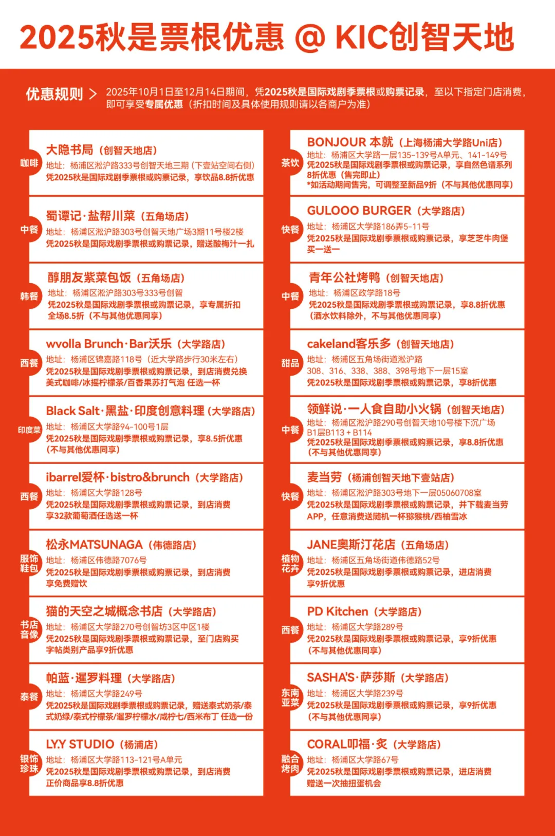 凭2025秋是国际戏剧季票根或购票记录,至指定门店消费,即可享受专属优惠。(具体店铺及优惠详见下图)
